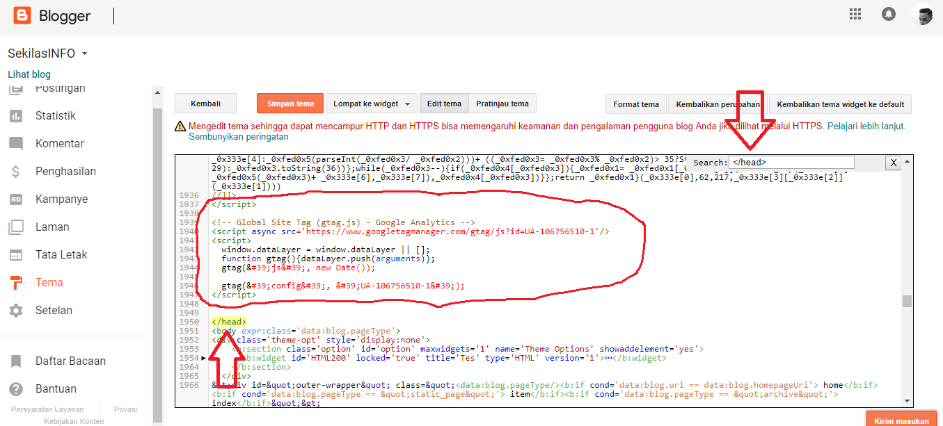 pertama yang saya lakukan yaitu menempatkan ID Pelacakan pada situs blog anda. Ingat